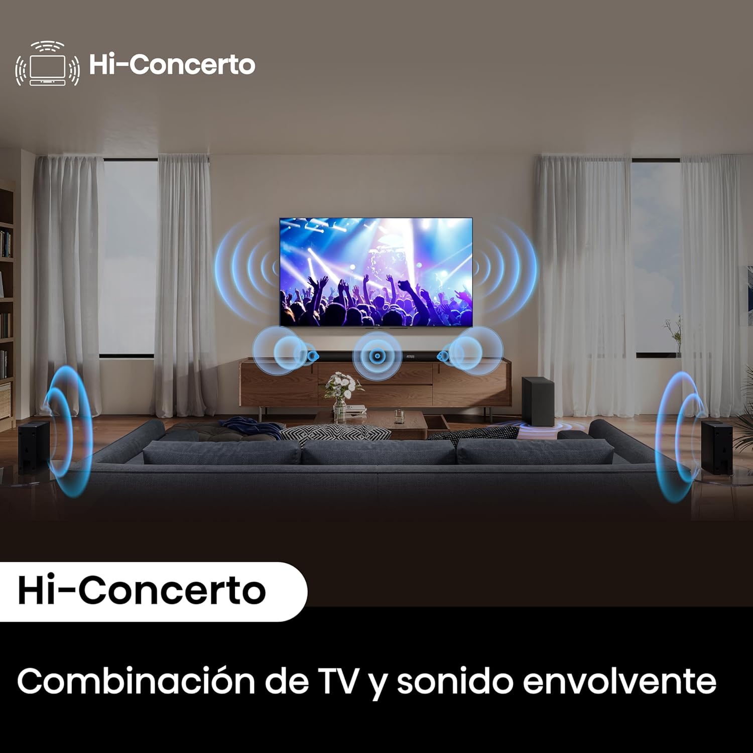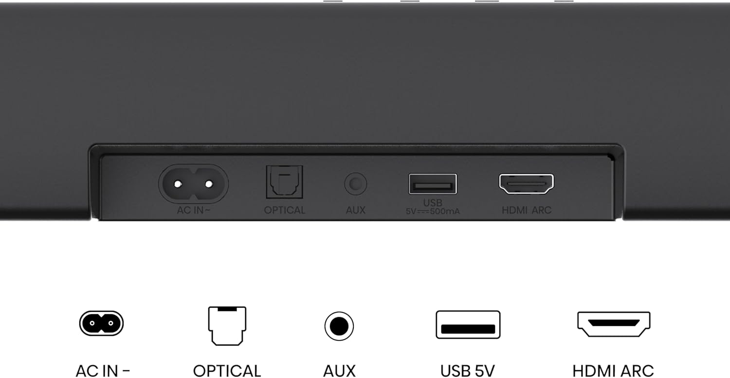 • 5.1 Canales] Vive un sonido envolvente de 5.1canales, que da vida a tus películas, música y juegos. La barra de sonido frontal, el subwoofer inalámbrico y los altavoces traseros semiinalámbricos te ofrecen una experiencia increíble.
