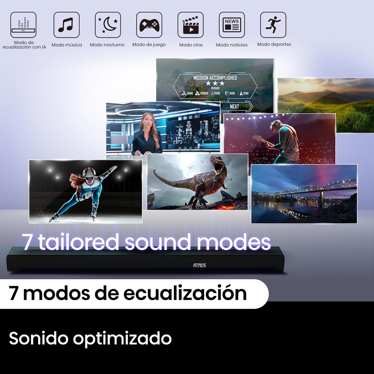 • [7 modos de ecualización] Personaliza tu sonido con 7 modos de ecualización, ajustados profesionalmente para cada escena.