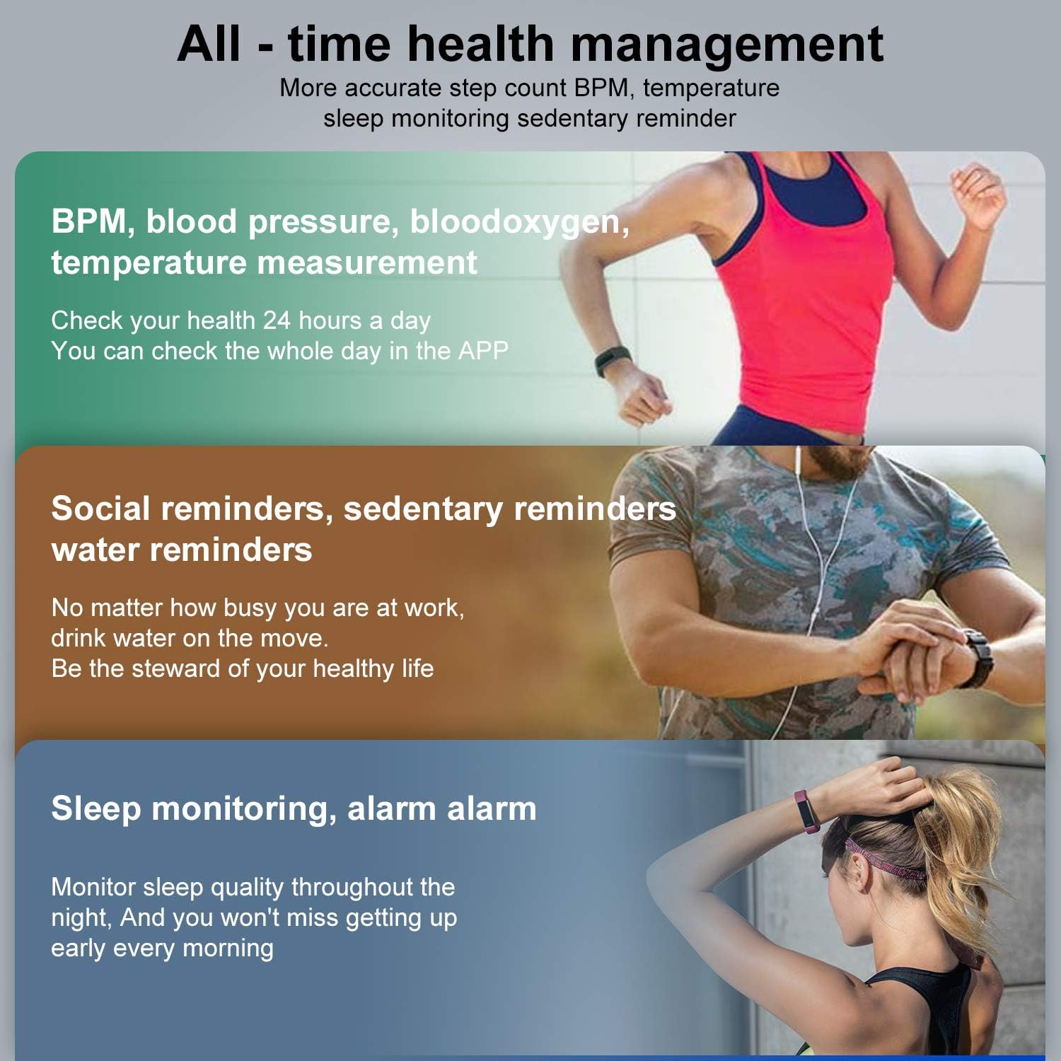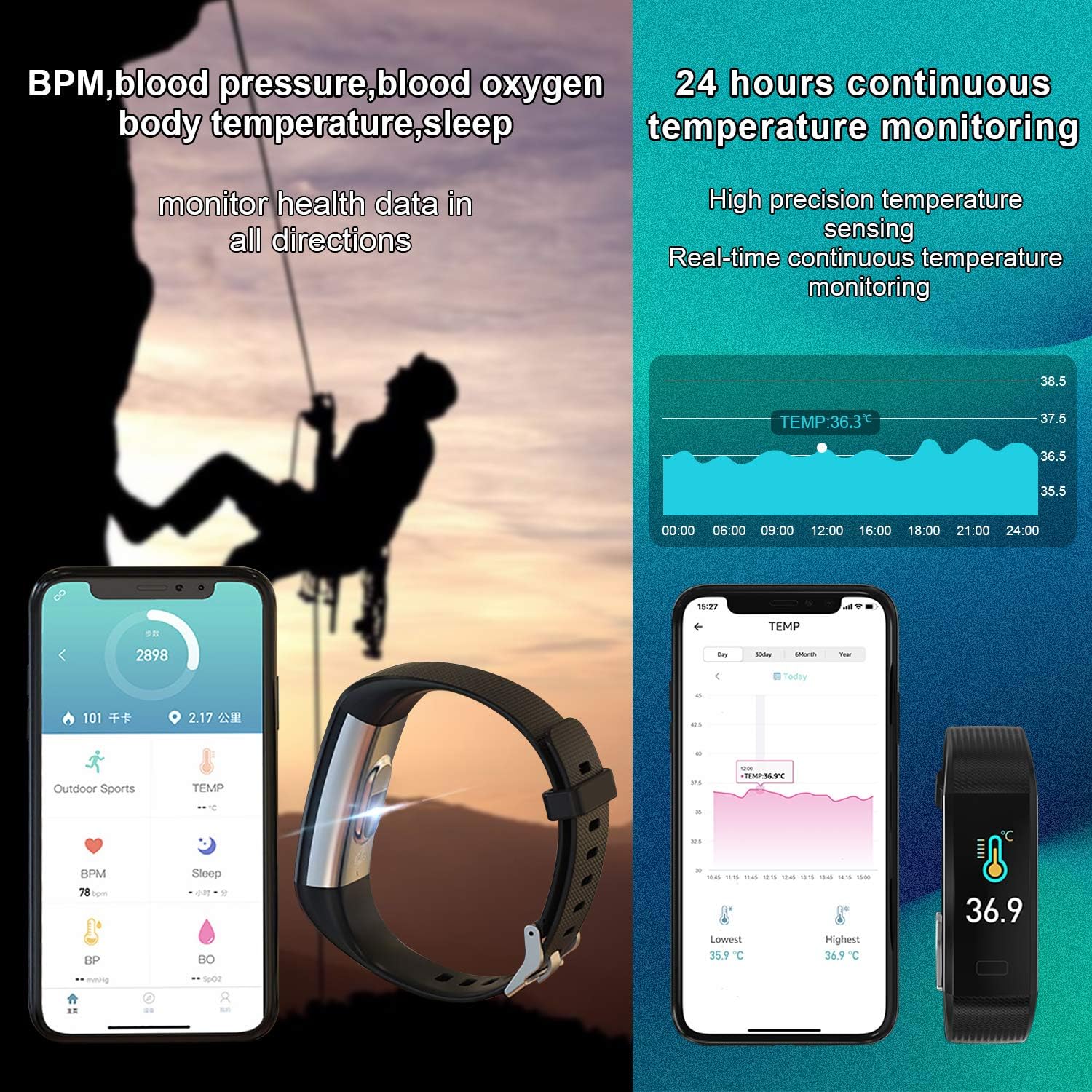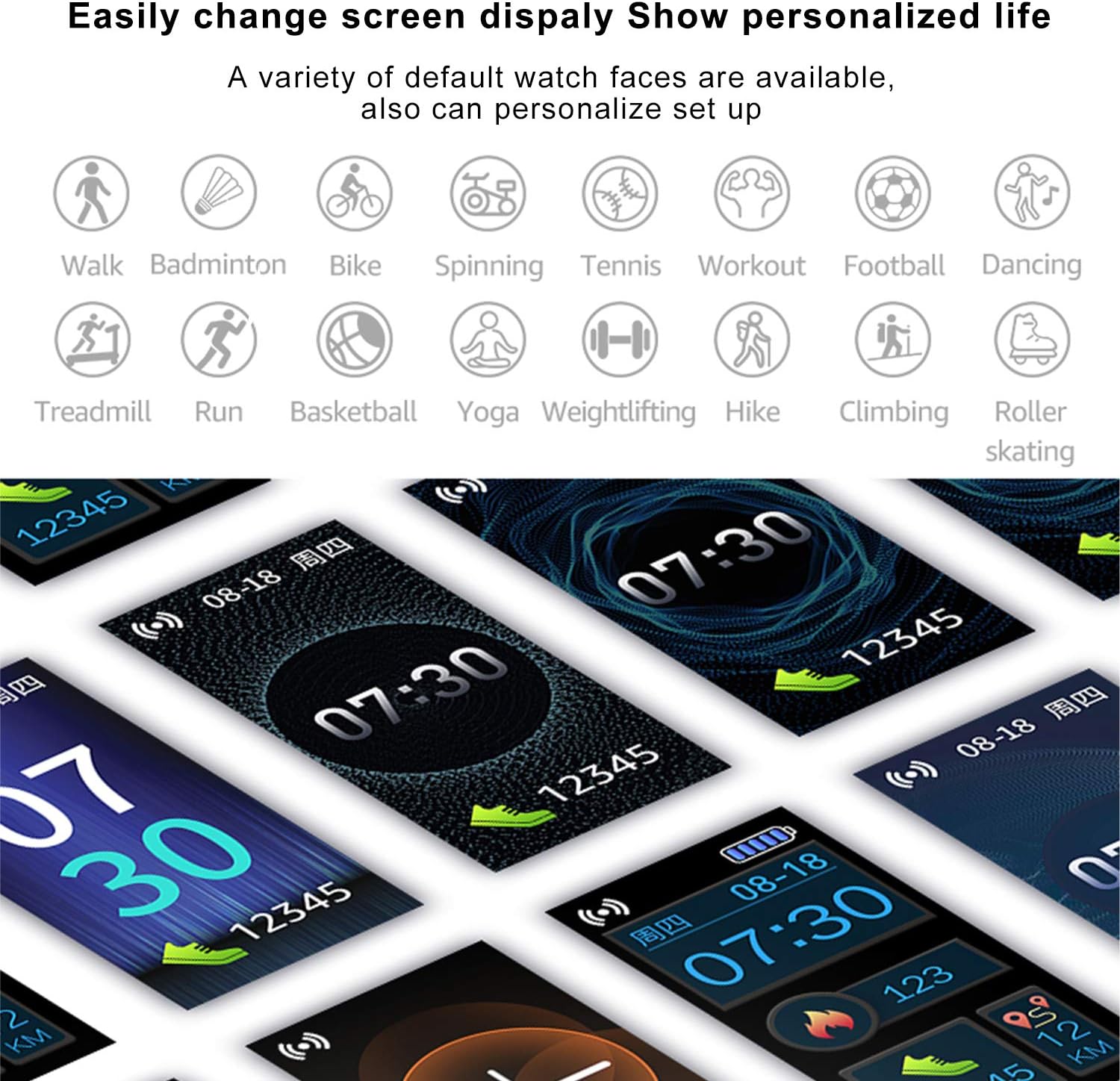 - 【Multifunción y Notificación Mensaje】Monitor de ritmo cardíaco, contador de pasos, cronómetro, recordatorio, contador de calorías, monitor de sueño, y soportar múltiples modos de deportes: caminar, correr, hiking, andar en bicicleta. Cuando reciba llamadas o mensajes, se vibrará para recordarle. Por favor, lea el manual para disfrutar de más funciones.