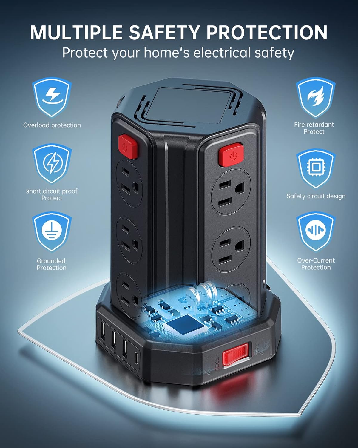 - Protección de seguridad múltiple: esta regleta de protección contra sobretensiones con USB tiene protección contra sobretensiones, protección contra sobrecargas, protección contra cortocircuitos, protección contra sobrecorriente, etc. La torre de energía puede cortar automáticamente la energía cuando se detecta una sobretensión para proteger tus costosos dispositivos como computadoras, televisores en casa, oficinas, dormitorios universitarios, etc.