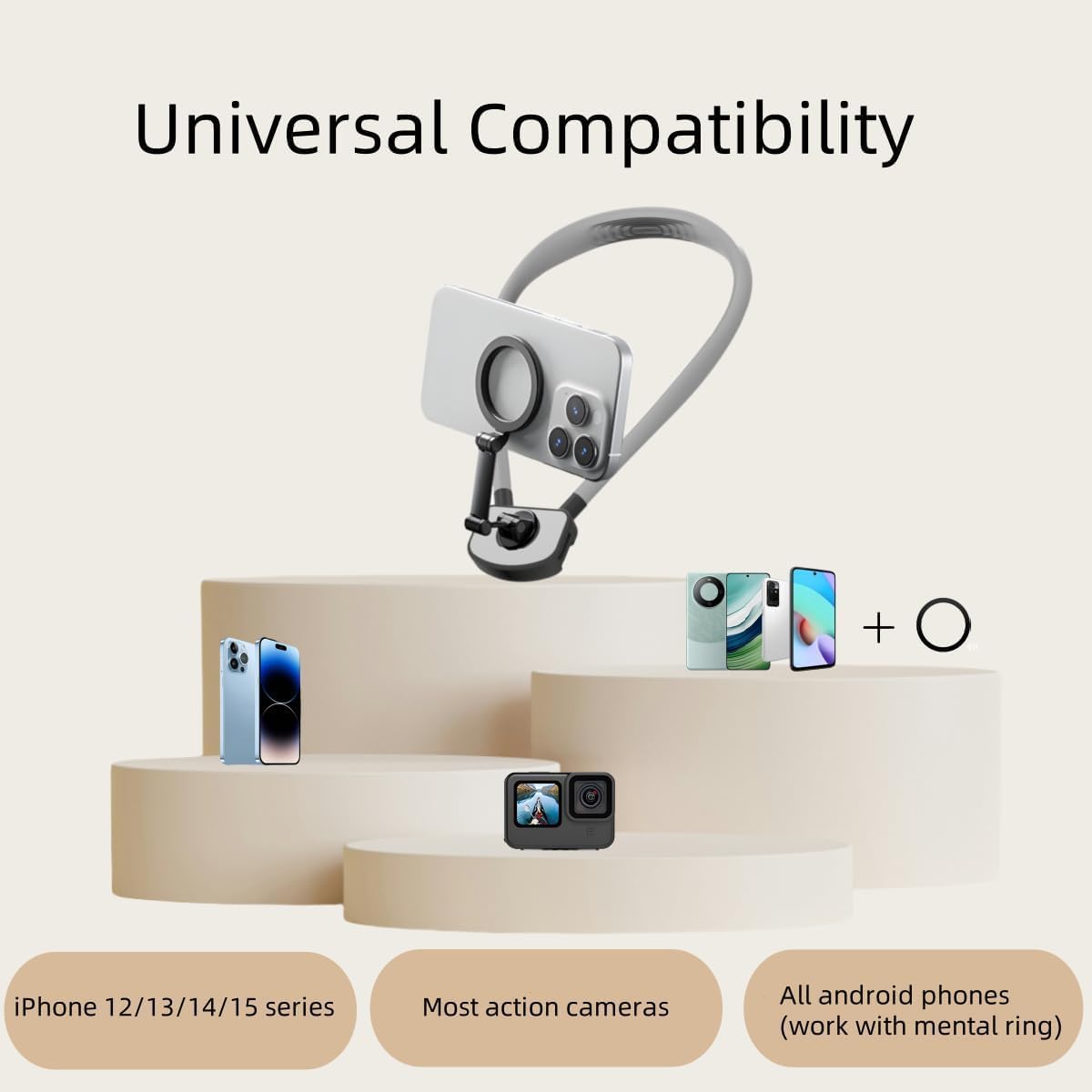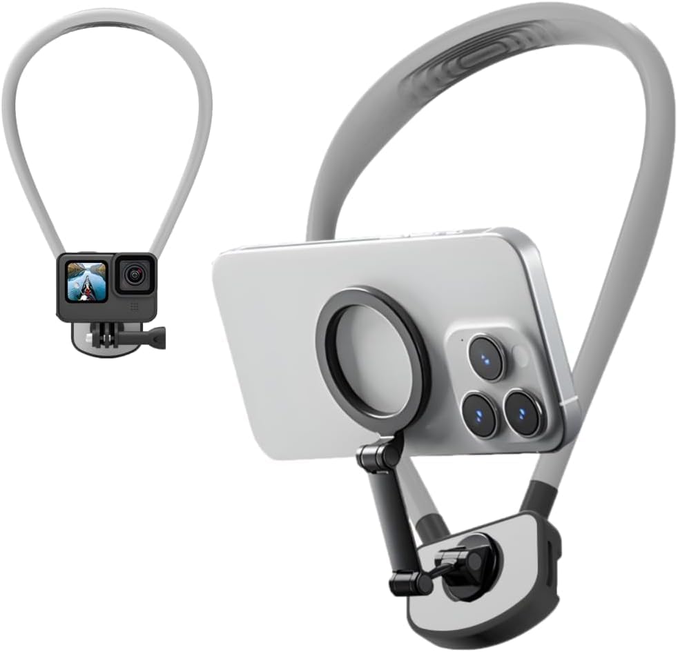 - 【Amplia compatibilidad】 el trípode magnético de cuello para iPhone es compatible con la gama completa de iPhone 12-16 y otros teléfonos magnéticos, retira la funda de tu teléfono cuando la uses. Para teléfonos no magnéticos, ponte la funda e instala el anillo magnético de metal antes de usar el soporte para teléfono celular del cuello. Además, el soporte para el cuello para el clip de filmación se puede extender de 2 a 3.5 pulgadas de ancho, adecuado para todos los teléfonos móviles.