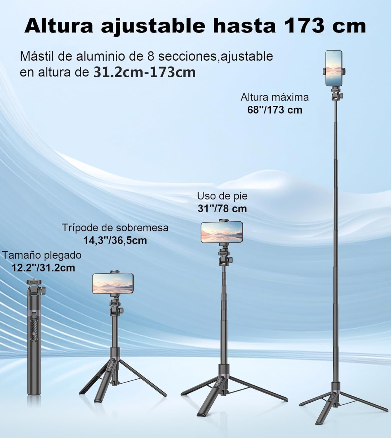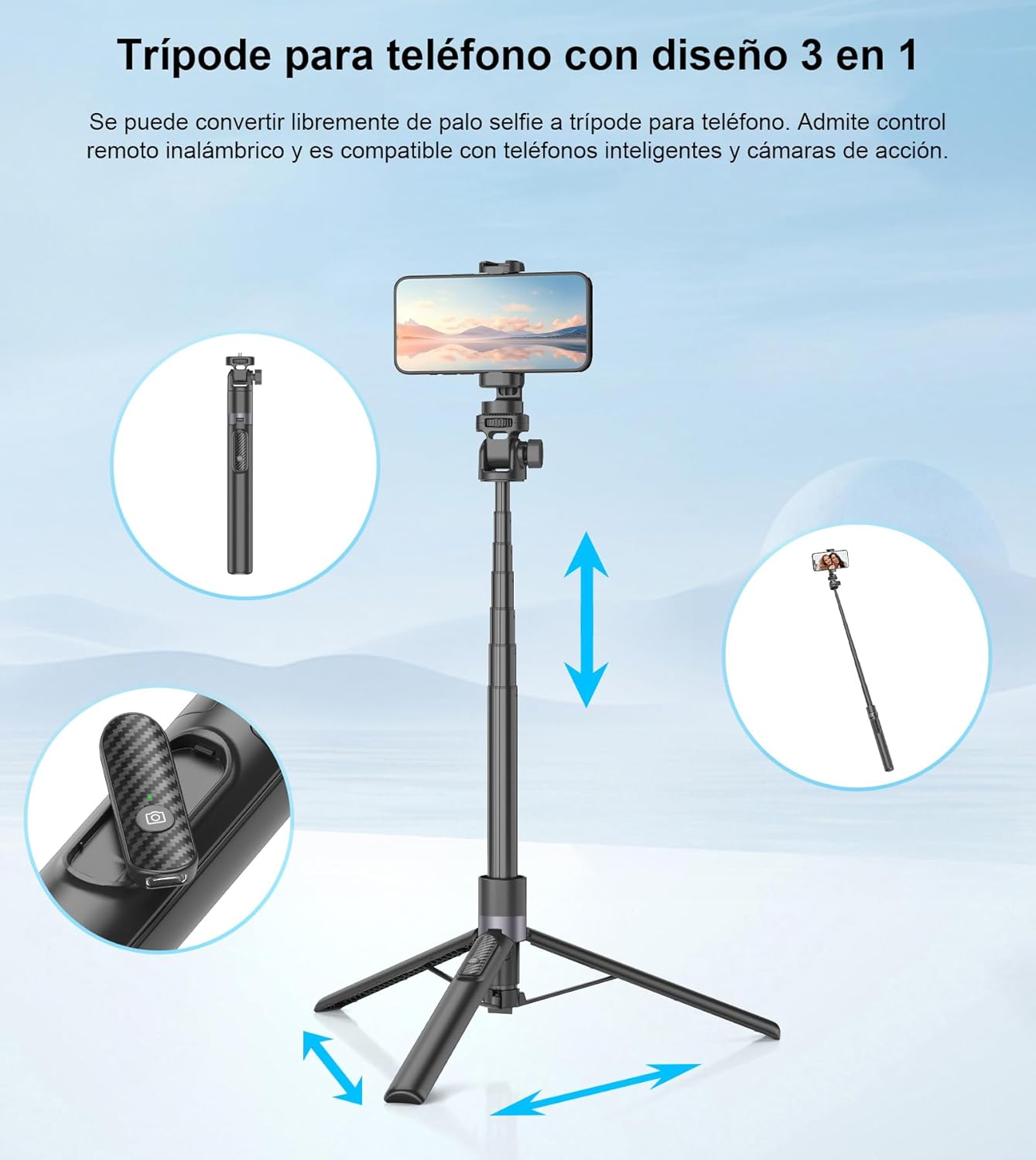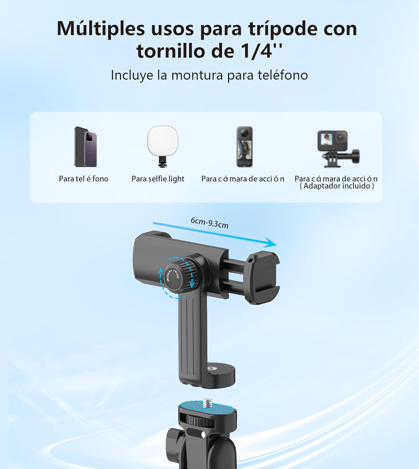 - Soporte para celular tripie giratorio 360 grados:Tripe telemovel Tripod head supports 360 °horizontal rotation and 110 °vertical rotation.You are free to switch portrait and landscape mode and find the perfect angle for your shots. Adjustable phone holder fits a wide range of 4-7 inch size smartphones.
